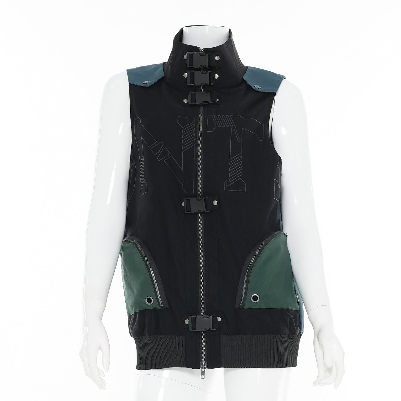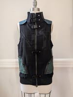 This vest is covered in hardware giving it a very cyber-punk vibe. Has a screen print with some of the letters of the Ozzon sub lable Conte in a subtle shade of grey across the chest. Back and shoulder details are more teal, pockets are more green.