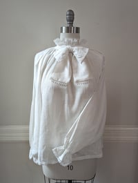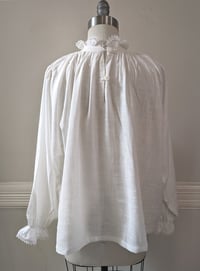 This versatile fall blouse is an excellent addition to any wardrobe. It features raglan sleeves that are gathered at the wrist with elastic, and a high collar trimmed with a lace edged ruffle. The lovely warm off-white color coordinates beautifully with your ivory pieces as well as any of your darker main pieces!