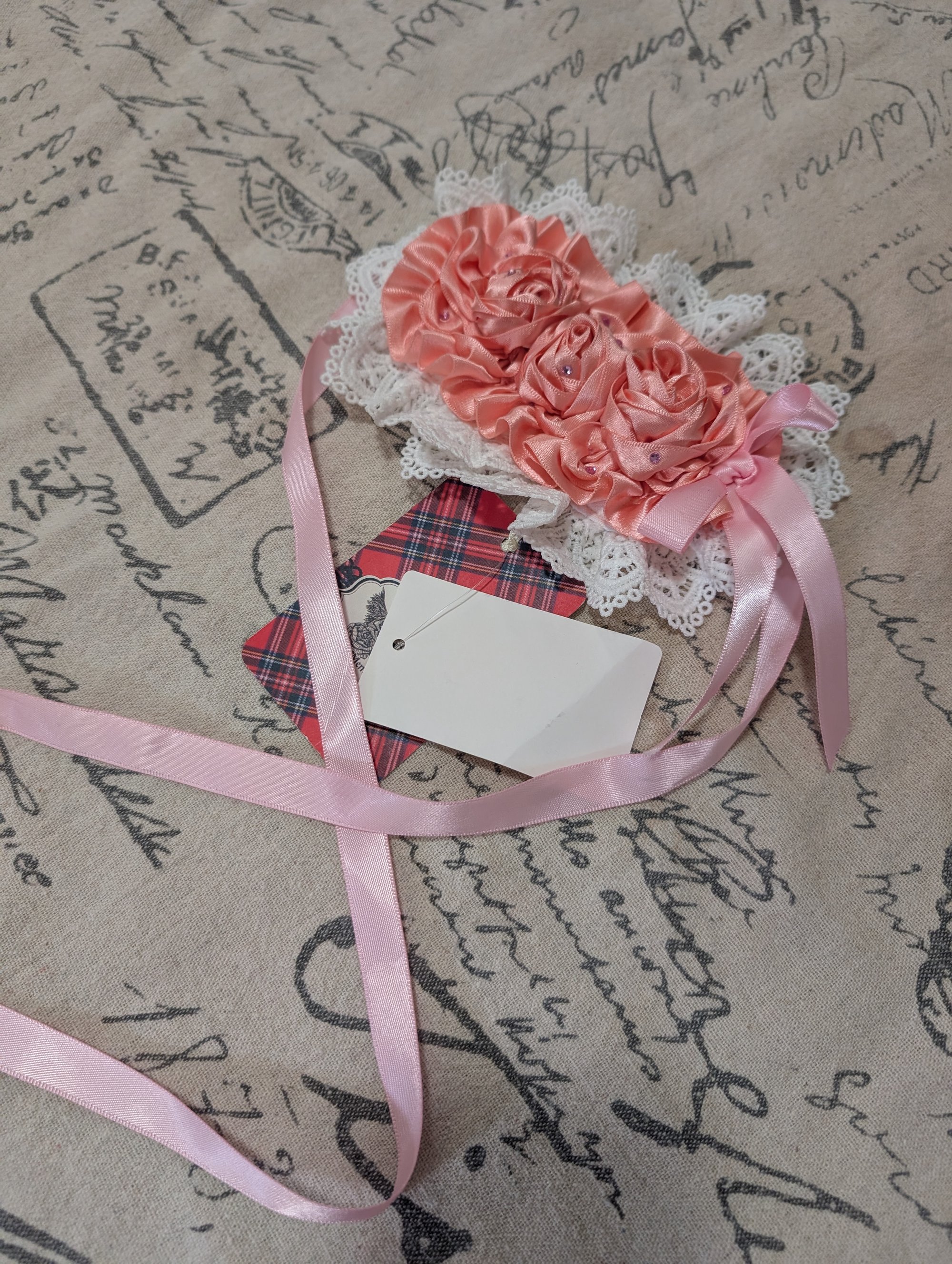 Satin ribbon roses are adorned with rhinestones, and trimmed with a ruffle and venise lace. An angled comb on the back helps keep this from slipping.