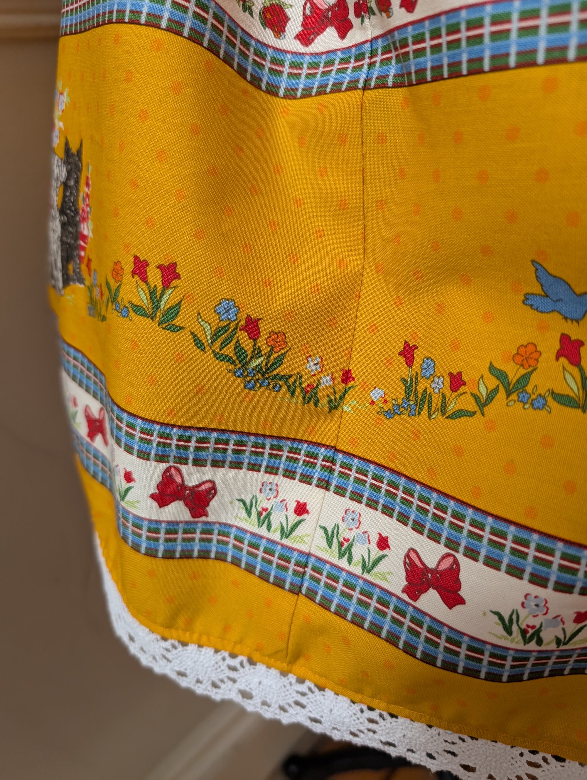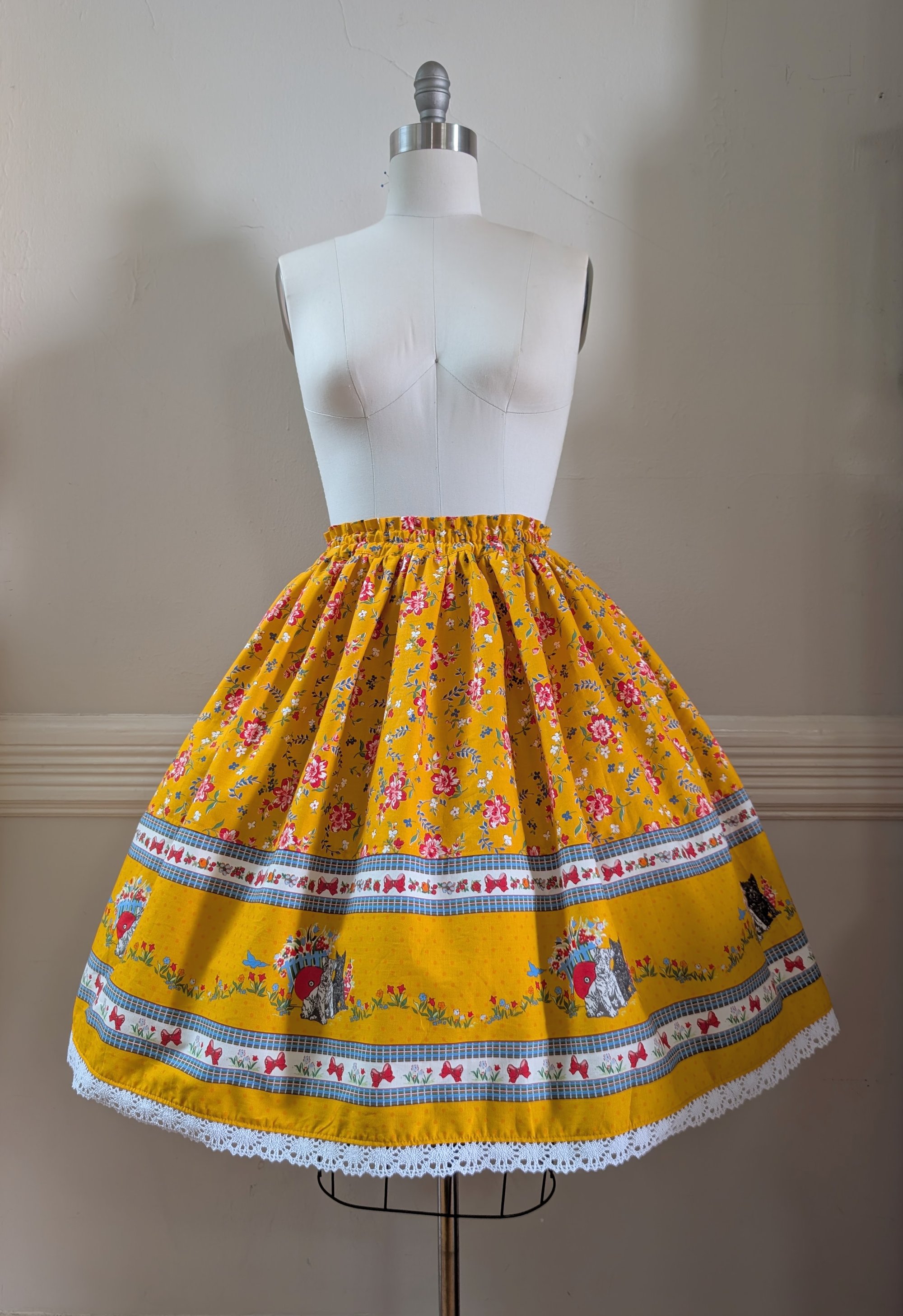 This bright sunny skirt is made of 2 coordinating prints featuring scotty dogs and bold florals. The print coordinates with reds, indigo blue, and white perfectly!