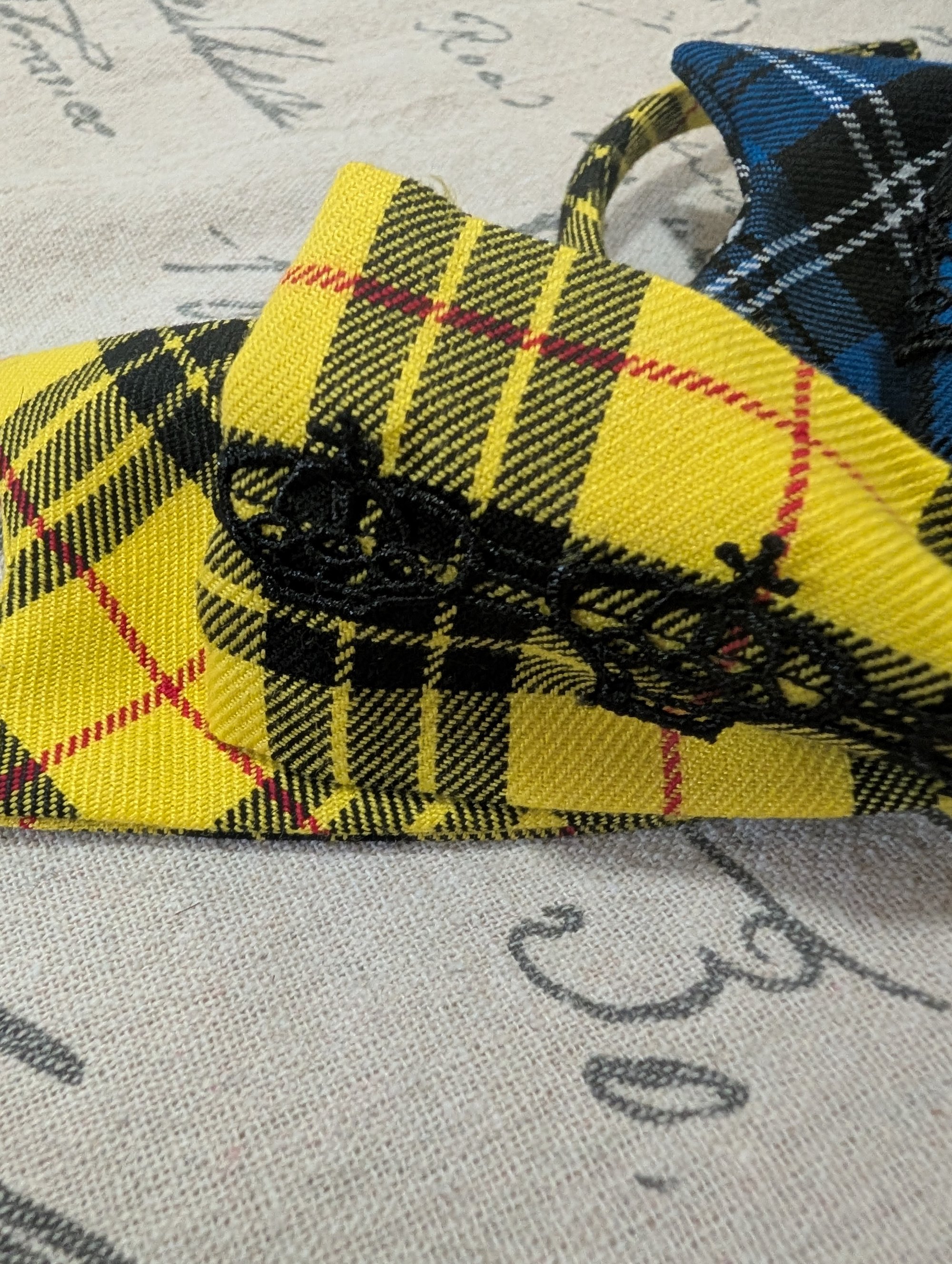 Tartan bow on a matching headband with crown venise lace. Comes in either blue or yellow